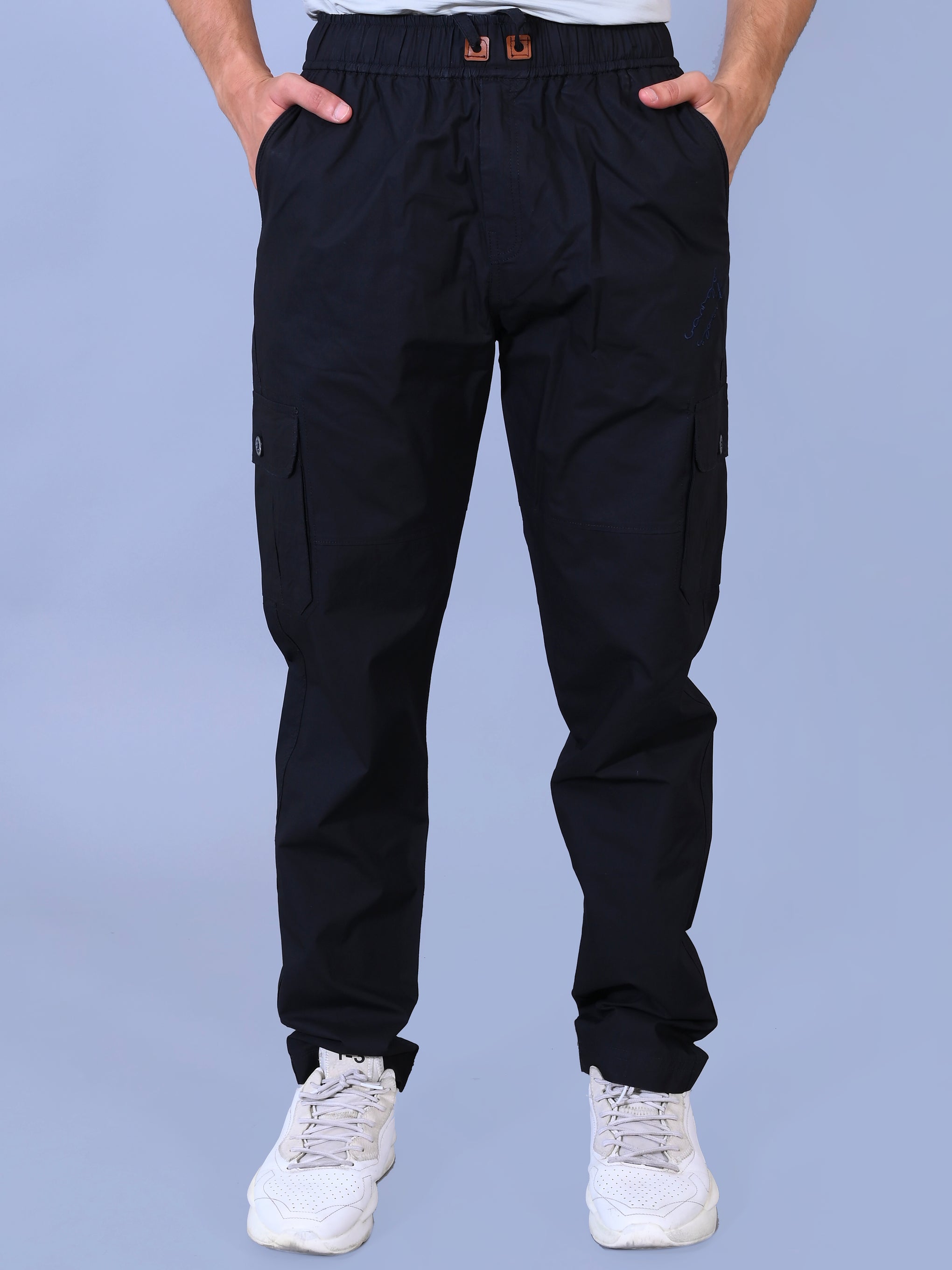 Upgrade your casual style with these premium black cargo. Crafted from high-quality, breathable cotton, they offer maximum comfort and durability. Featuring six functional utility pockets, an elasticated waistband with an adjustable drawstring, and stylish embroidery, these pants provide a perfect, relaxed fit for daily wear and outdoor adventures.